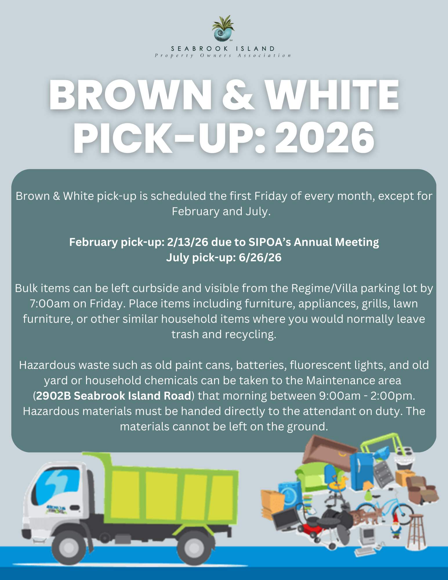 SIPOA will be using a new service provider this year for trash, recycling, and yard debris pickup. Beginning on February 2, 2026, Sandlapper Waste will provide trash and recycling collection services on Seabrook Island. The collection schedule will be mostly the same, with yard debris collection being moved to Wednesday and Villa and Regime recycle pickup on Tuesdays. The annual collection schedule is attached for your reference.